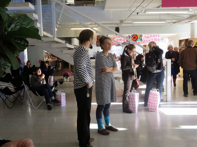 Minulle tarjoutui oiva tilaisuus päästä tutustumaan Marimekon sydämeen, Helsingin Herttoniemeen, kun naapurin rouva pyysi minua mukaan "marimekkofanien" retkelle. Herttoniemessä on Marimekon pääkonttori, kangaspaino, malliompelimo ja kaksi myymälää. Iloinen bussilastillinen sitten meitä faneja lähtikin keskiviikkona Turusta Helsinkiin, ja muutama rohkea mieskin oli mukana.
